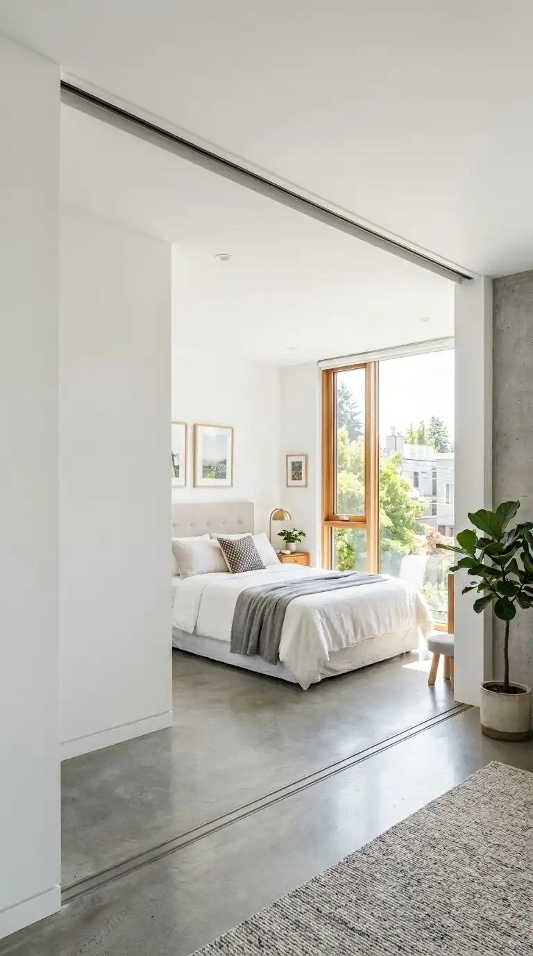 The sliding wall is a movable partition that allows spaces to be opened or closed as needed. The wall slides on a track, disappearing into a pocket or against another wall. The space is flexible.