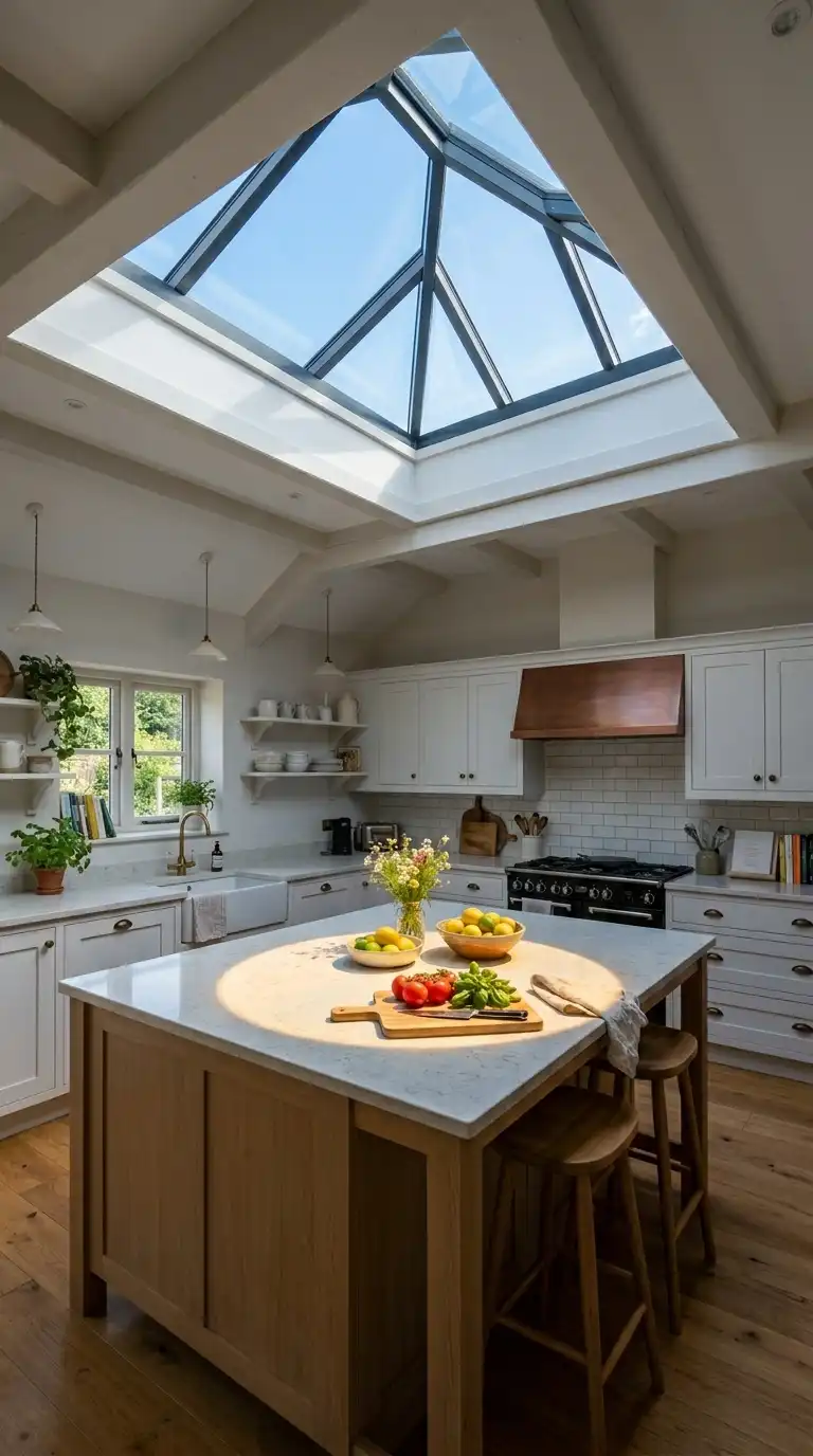 The skylit interior brings light from above. A skylight or roof window admits direct or diffused light from the sky. The light changes with the time of day and weather.