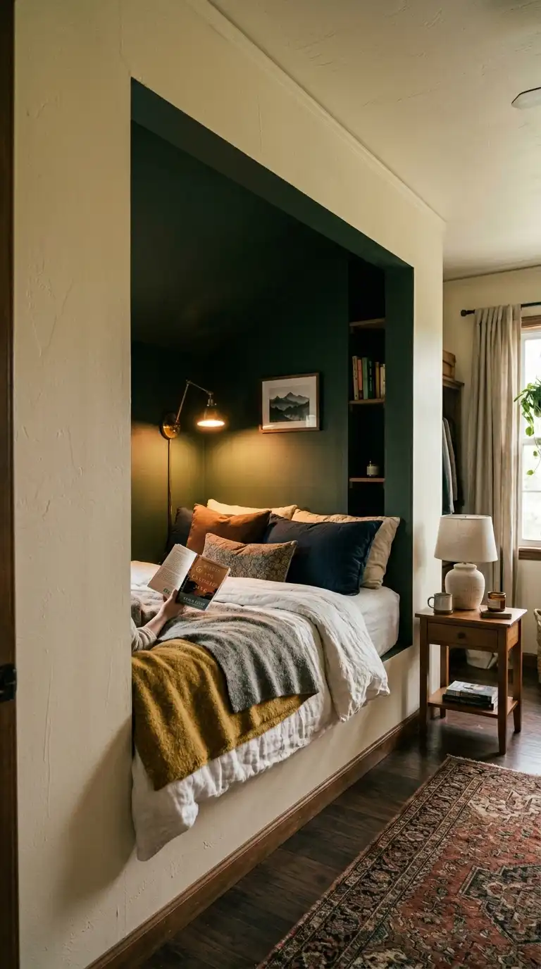 The alcove is a recessed niche in a wall. The alcove creates a small, intimate space within a larger room. It can hold a bed, a desk, a reading chair, or a sculpture.