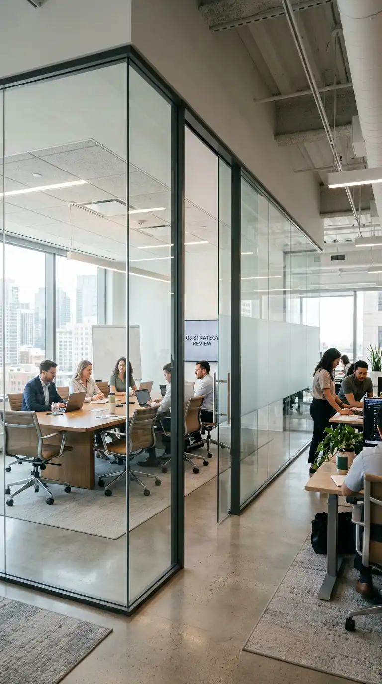 The glass wall interior replaces solid walls with glass. Rooms are visually connected while remaining acoustically separate. Light flows through the entire floor plate.