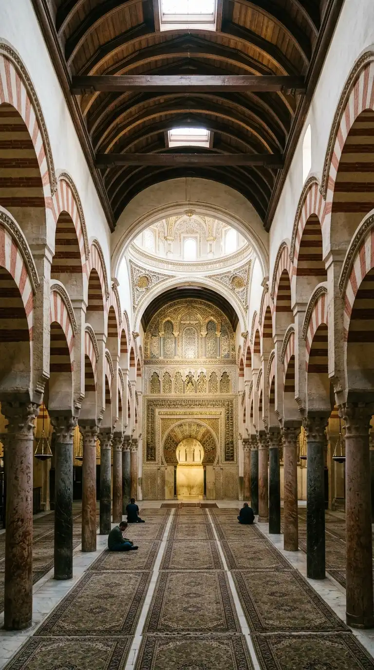 The Great Mosque of Córdoba (Spain, 784-987) is the defining example. The emotional effect is rhythmic, infinite, and meditative.