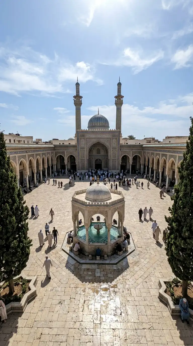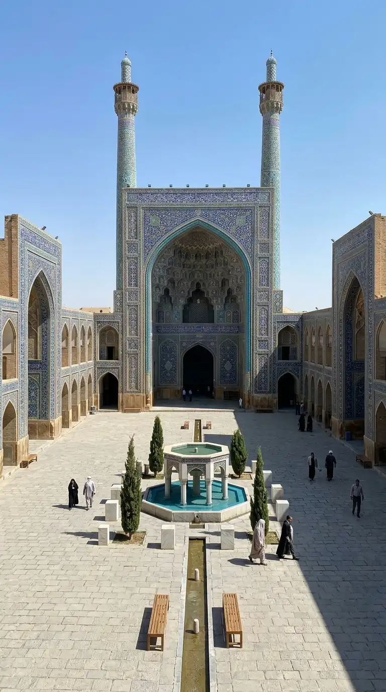 The iwans are framed by pishtaqs (tall, decorated portals). The courtyard has a central fountain for ablutions. The emotional effect is axial, monumental, and hierarchical.