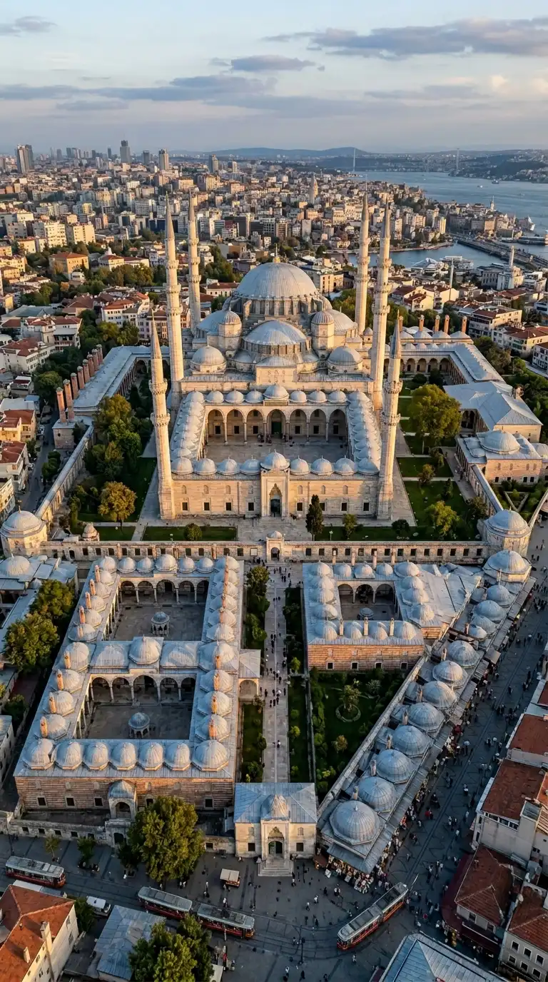 The Süleymaniye Complex in Istanbul (1557) by Mimar Sinan is the defining example. The emotional effect is benevolent, urban, and comprehensive.