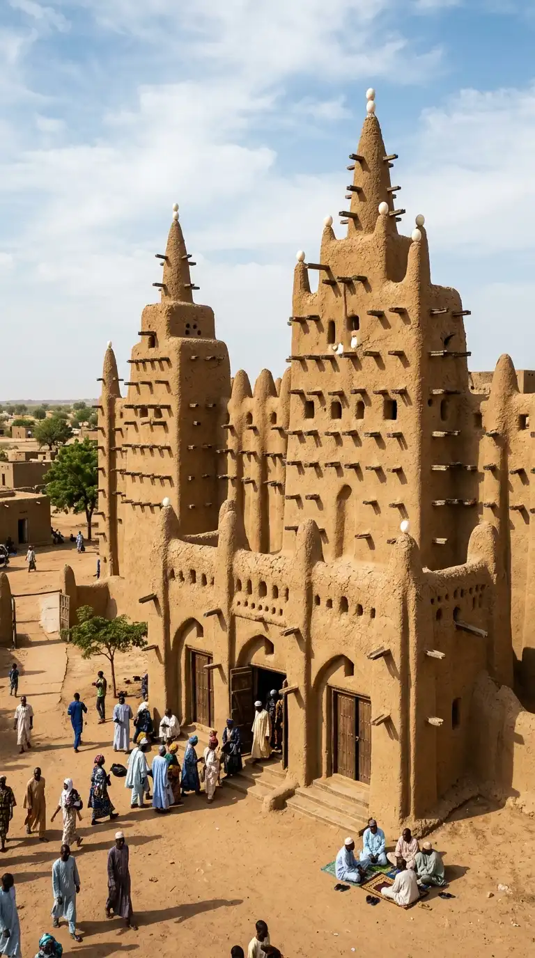 The sub-Saharan African mosque is built of mud brick and timber. The Great Mosque of Djenné in Mali (1907, but representing a much older tradition) is the most famous example. The mosque has three large towers, each topped with ostrich eggs. The walls are thick and massive, with timber beams projecting from the surface for scaffolding and ventilation.