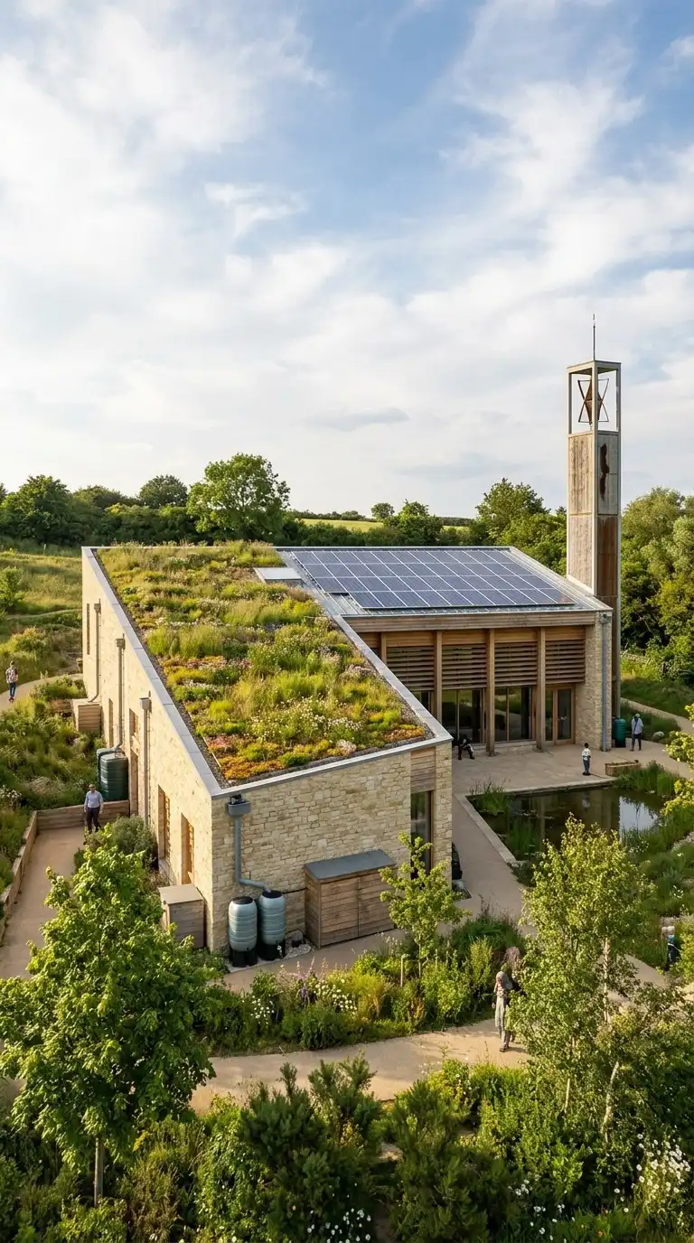 The green mosque integrates environmental sustainability with spiritual practice. The roof is planted with native vegetation. The building uses passive cooling, rainwater harvesting, and solar energy.