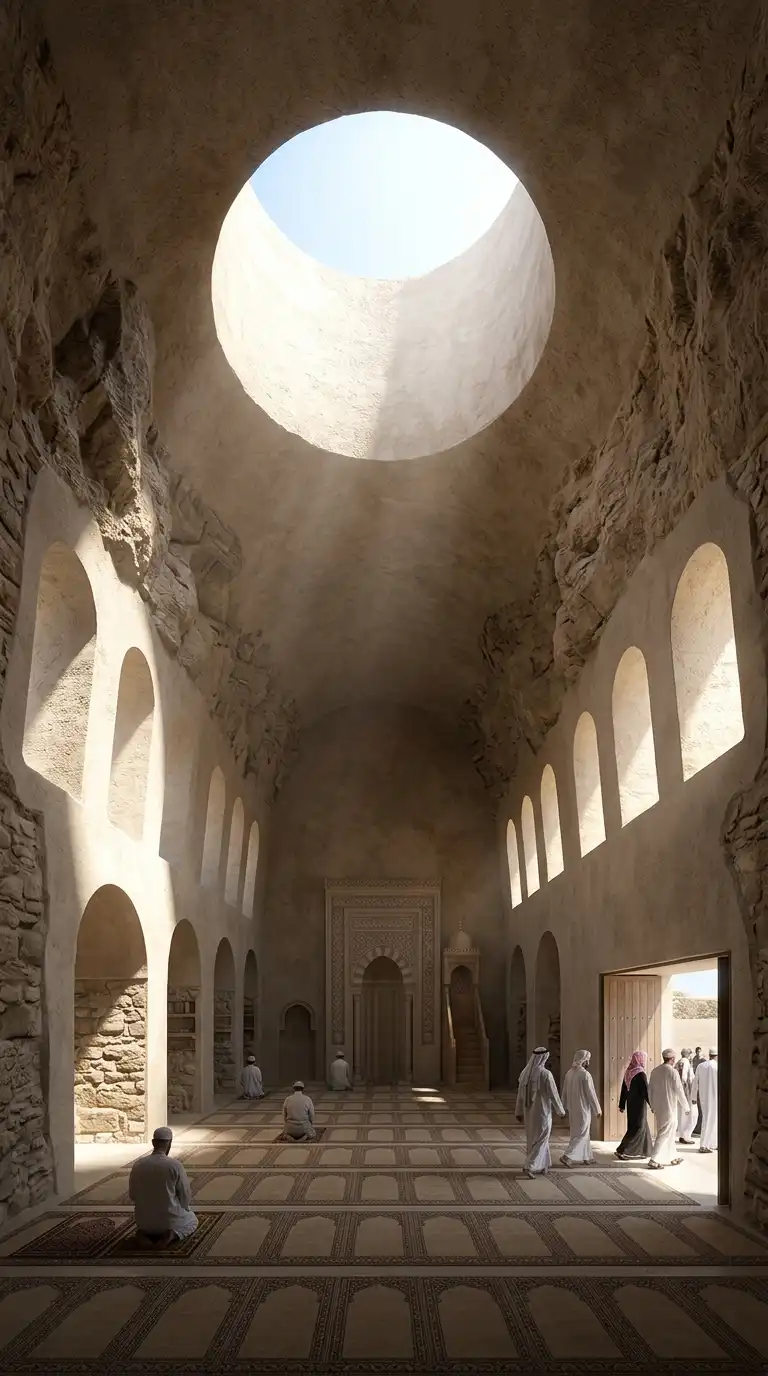 The underground mosque is carved into a hillside or excavated below grade. The earth provides thermal mass, cooling the space in summer and warming it in winter. Light enters through courtyards, light wells, or a central oculus.
