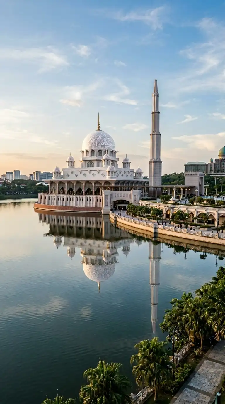 The floating mosque is built on water. The mosque appears to float on a lake, river, or sea. The reflection doubles the building. Water surrounds the worshipper.