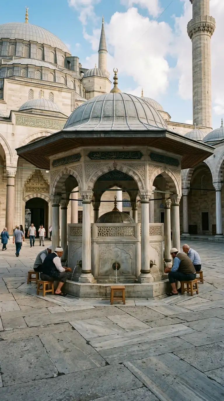 The shadirvan is a large ablution fountain, often in the courtyard of an Ottoman mosque. Unlike a simple pool, the shadirvan is a covered structure with water flowing from multiple taps. Worshippers perform ablution around its perimeter.