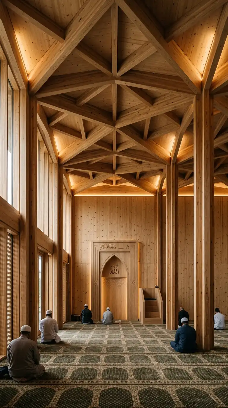 The contemporary timber mosque uses mass timber construction — cross-laminated timber (CLT) and glue-laminated timber (glulam) — for structure and finish. The timber is exposed, warm, and sustainable. The form is often geometric and contemporary.
