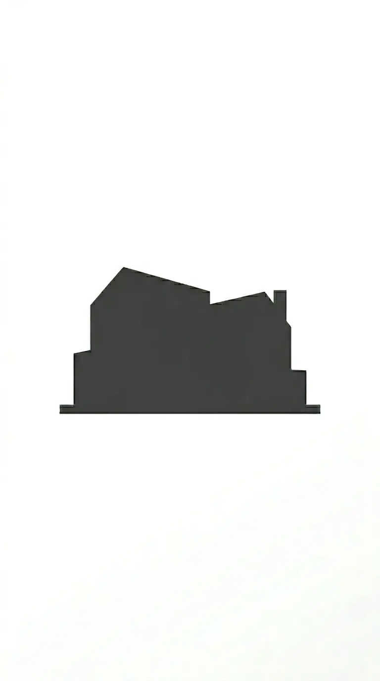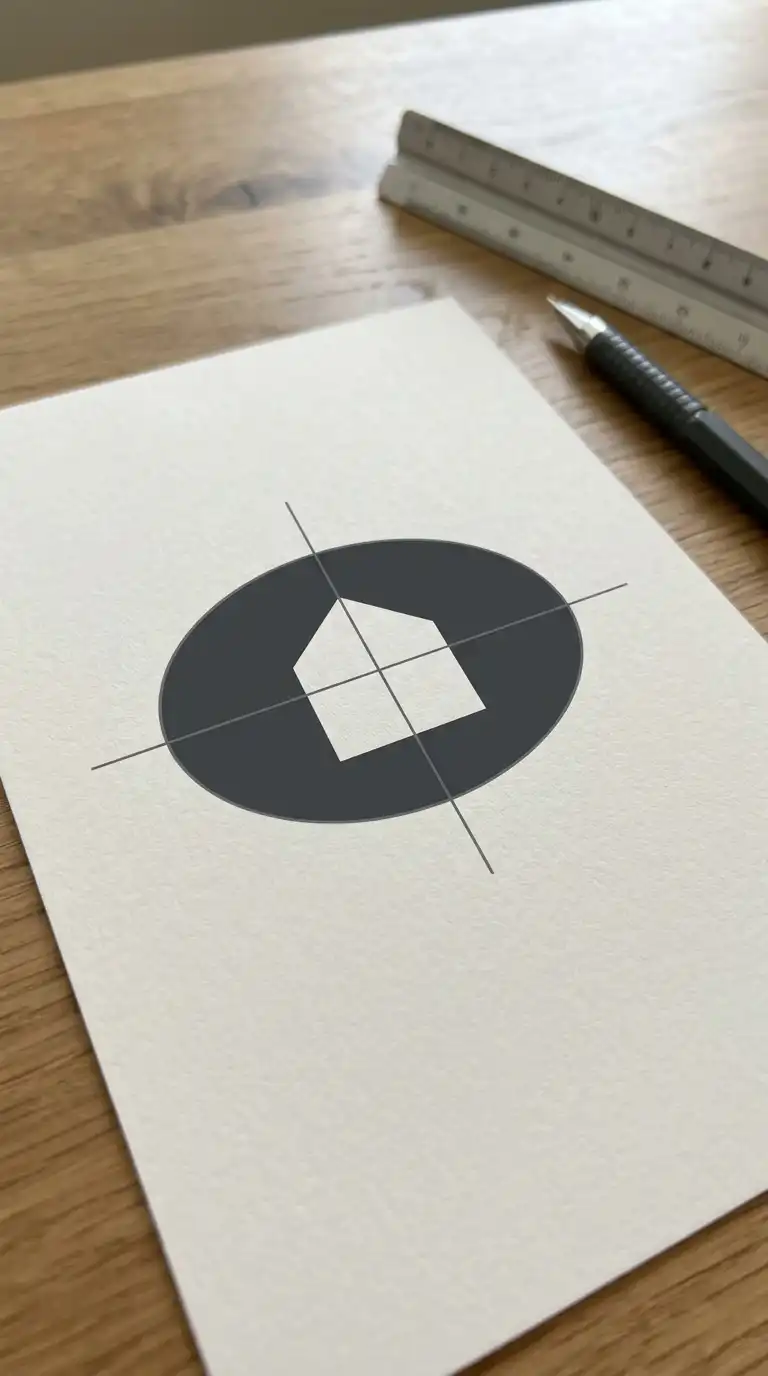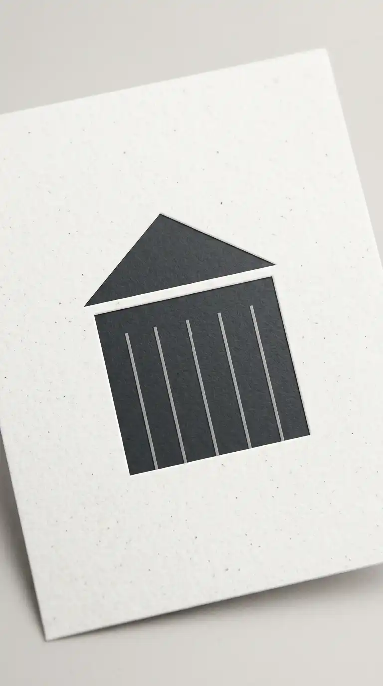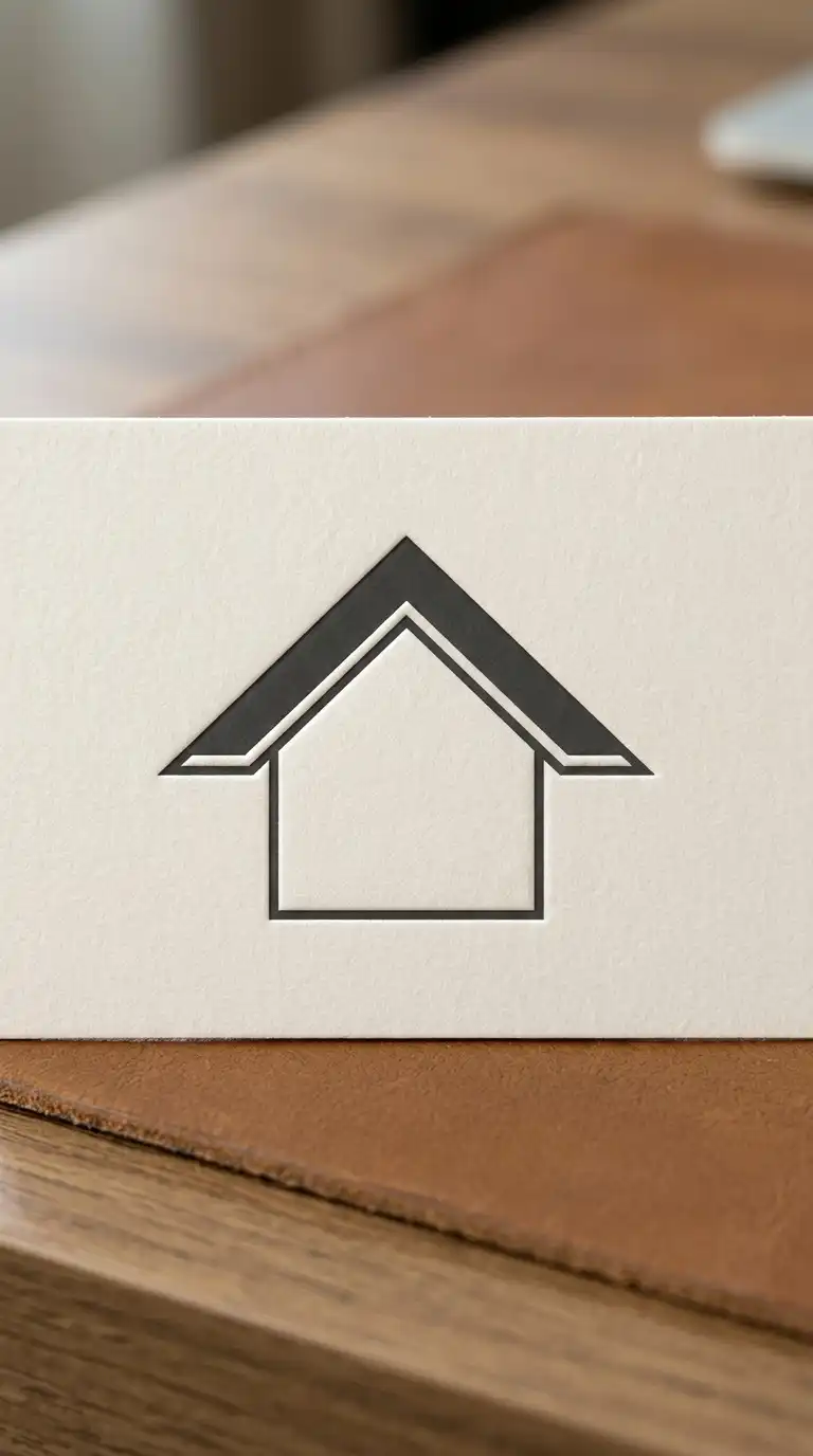 The abstract building mark reduces a building to its essential geometry. A rectangle, a triangle for a roof, a few lines for windows. The form is simplified to the point of abstraction. The logo is not a picture of a building — it is the idea of a building.