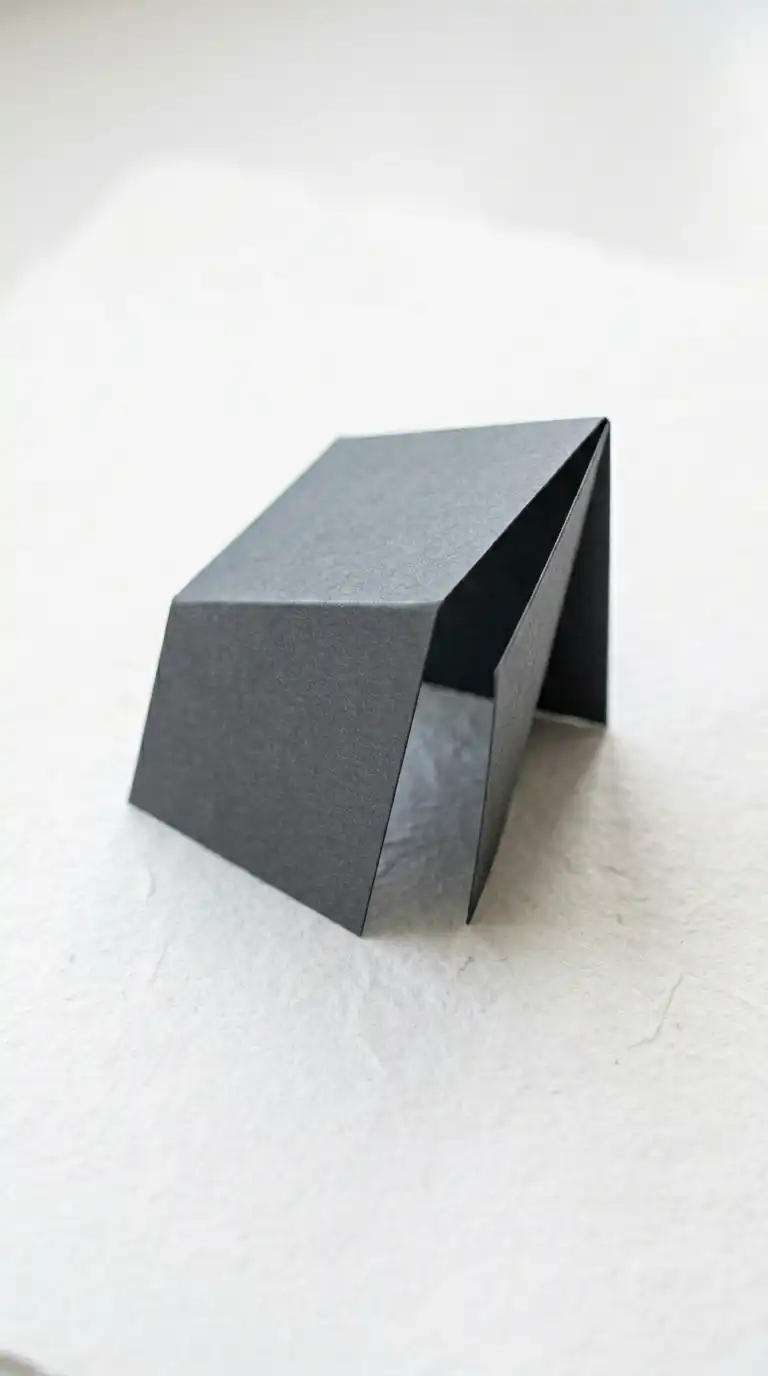 The folded paper logo suggests a piece of paper folded into a three-dimensional form. The folds create planes that suggest walls, roofs, and floors. The logo is about transformation from flat to spatial.