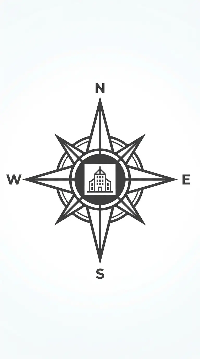 The compass rose logo uses the architectural compass as the central element. The compass points north, south, east, west. The logo suggests orientation, direction, and site analysis.