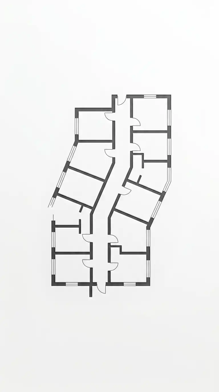 The plan abstraction logo uses a fragment of a floor plan as the mark. A corridor with rooms. A staircase. A courtyard. The plan is cropped so it is no longer readable as a specific building. It becomes a pattern.