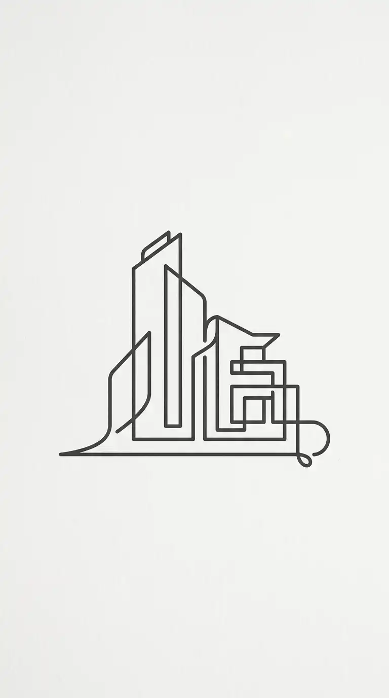 The single line drawing logo is a continuous line that traces a building form. The line never lifts from the paper. The drawing is minimal, elegant, and abstract. The line suggests a roof, a wall, a stair, a column.
