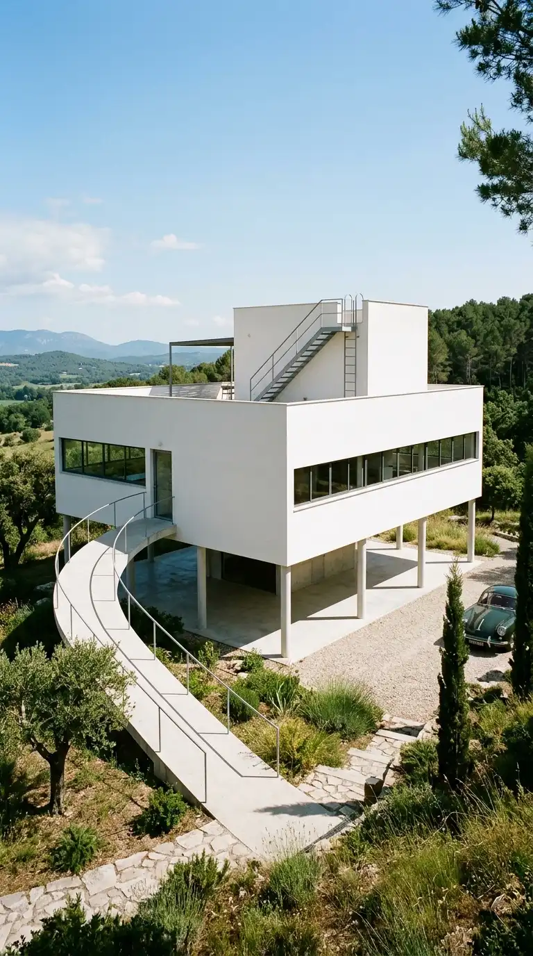 The International Style villa is the purest expression of early modernism. The form is a simple white cube or rectangular prism. Walls are smooth and unadorned. Windows are ribbon-like, running horizontally across the facade. The roof is flat. The building is raised on pilotis — thin columns — lifting the main volume above the ground.