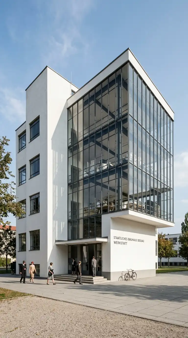 The Bauhaus workshop building in Dessau (1925-1926), designed by Walter Gropius, is the manifesto of the Bauhaus school. The form is an asymmetrical composition of intersecting volumes: a three-storey workshop wing, a five-storey studio wing, a one-storey bridge connecting them, and a glass curtain wall wrapping the corner.