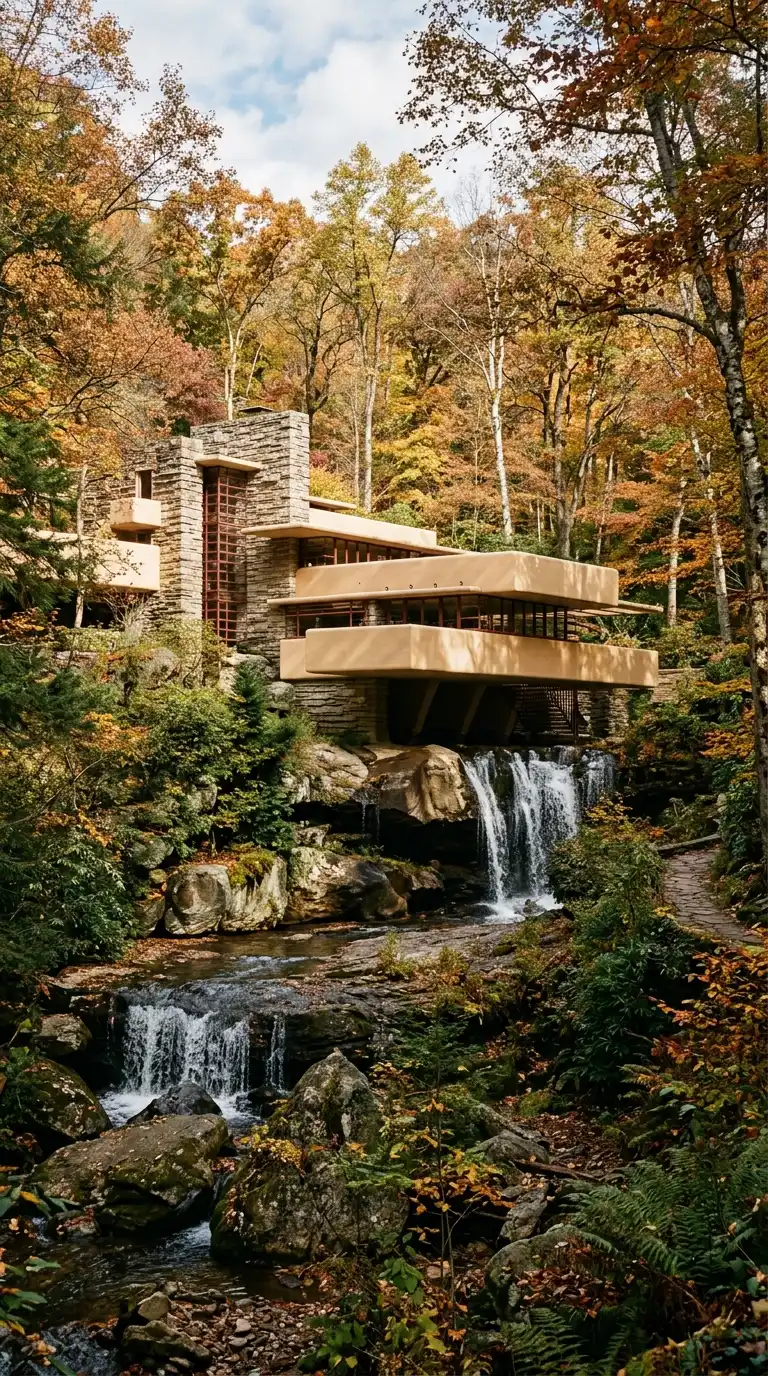 Frank Lloyd Wright’s Fallingwater (1939) is modernism’s most famous house. The design is a series of concrete terraces cantilevered over a waterfall in rural Pennsylvania. The house does not sit beside the waterfall — it sits above it, with the water audible from every room.