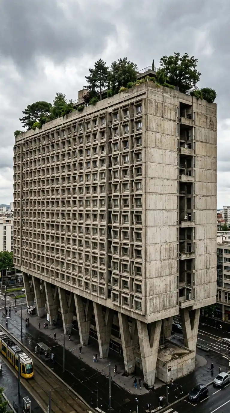 Le Corbusier’s Unité d’Habitation in Marseille (1952) is the prototype. The building is raised on pilotis, with interior streets, a rooftop garden, and integrated shops and amenities. The emotional effect is heroic, collective, and unapologetically heavy.