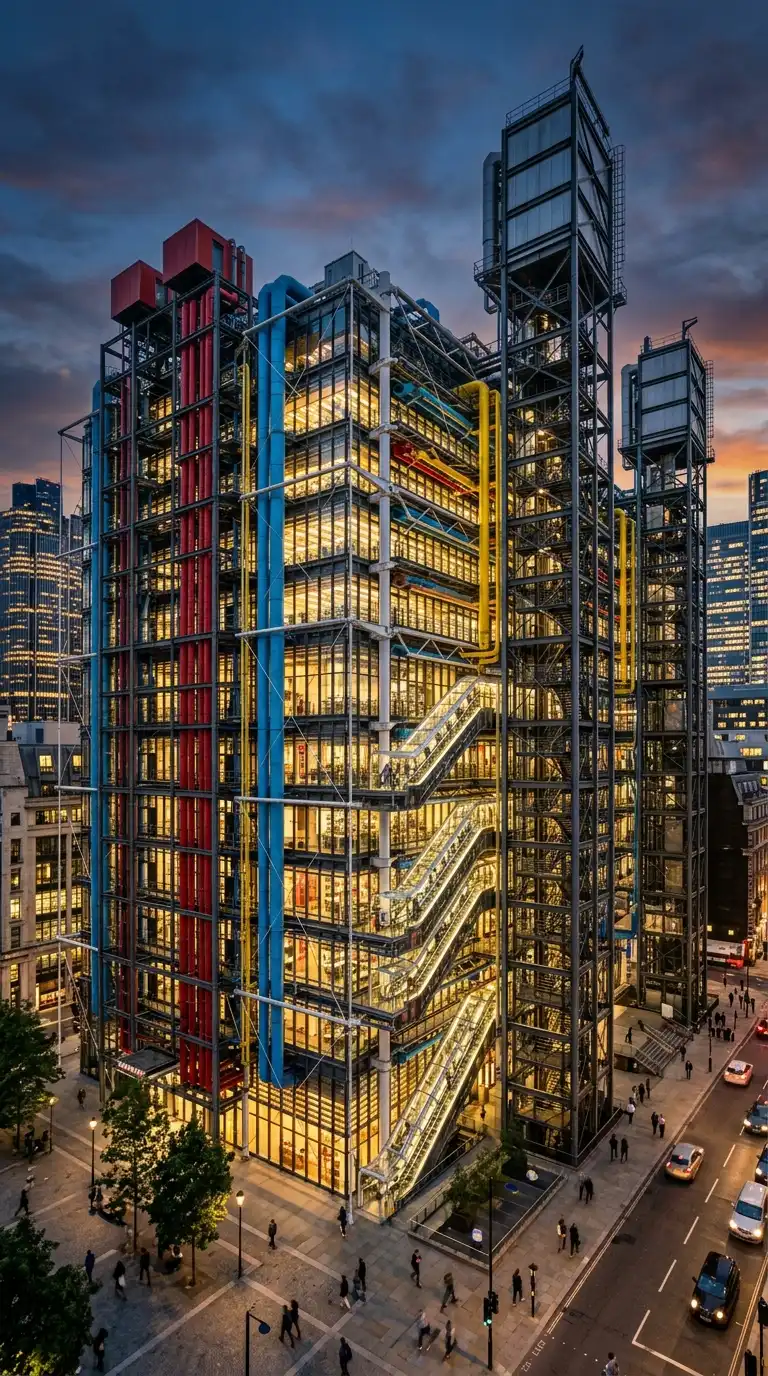 The High-Tech movement celebrates industrial technology and exposed services. The building’s mechanical systems — ducts, pipes, escalators, elevators — are displayed prominently, often in bright colours, rather than hidden in shafts.