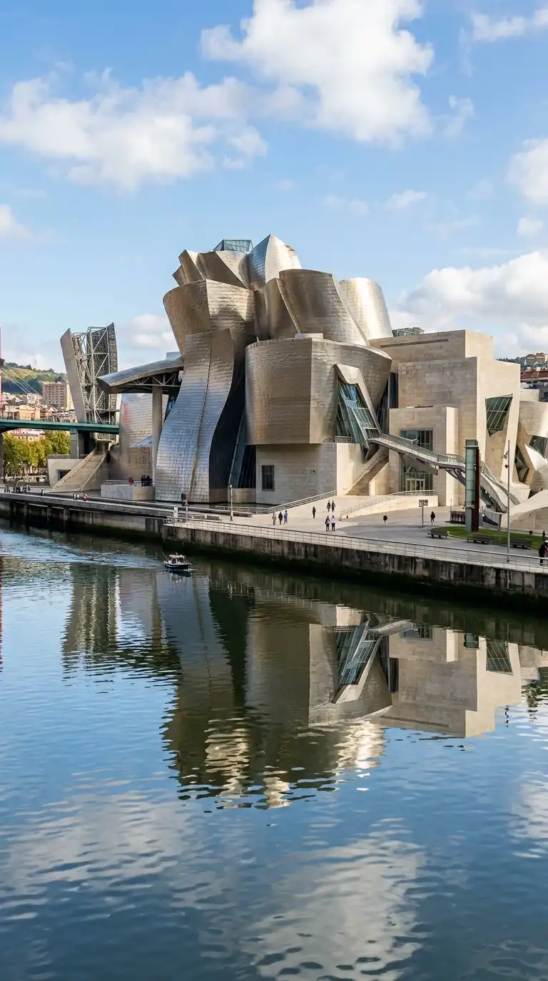 The form is composed of curving titanium panels, limestone, and glass. There are no right angles. The building seems to move, reflecting light and sky across its faceted surface. The emotional effect is disorienting, exciting, and sculptural.