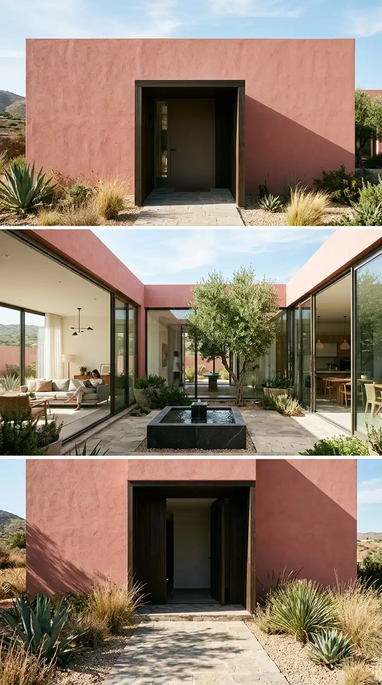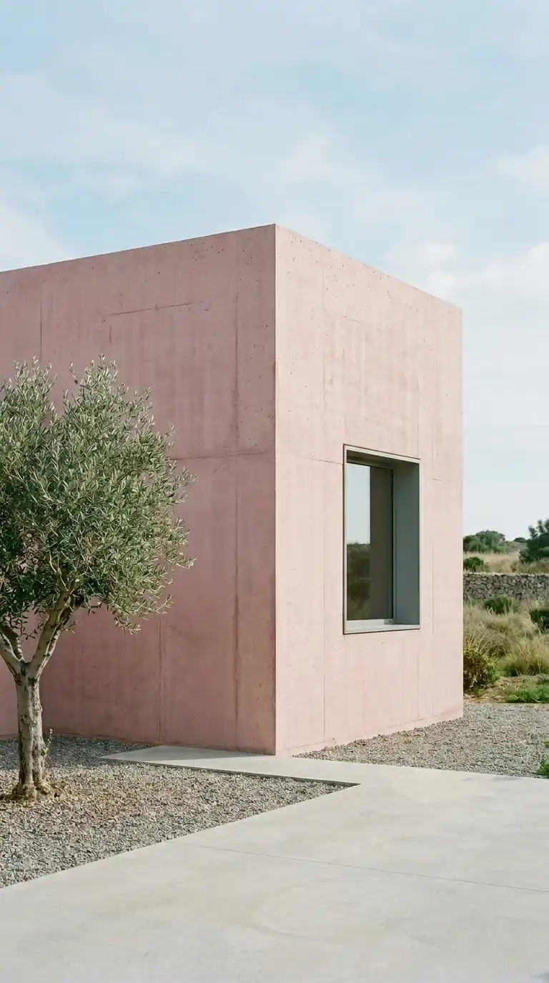 John Pawson’s Neuendorf House (1987) is a defining example. A pink concrete cube in a Majorcan landscape. A single window. No ornament. No visible hardware. The emotional effect is calm, contemplative, and precise.