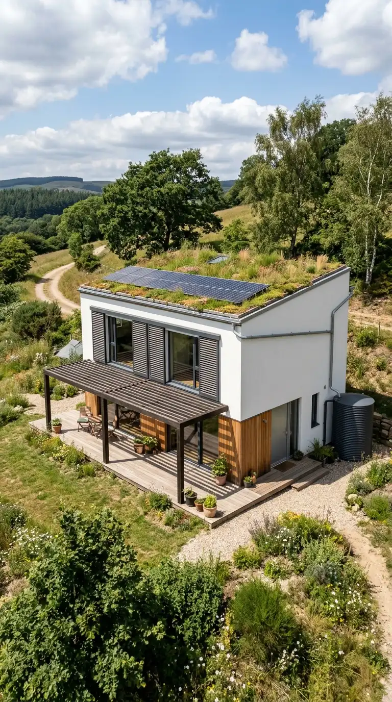 Eco-modern architecture integrates sustainability with modern design. The form is shaped by passive solar principles, natural ventilation, and material efficiency. The building is oriented for sun, shaded in summer, and airtight in winter.