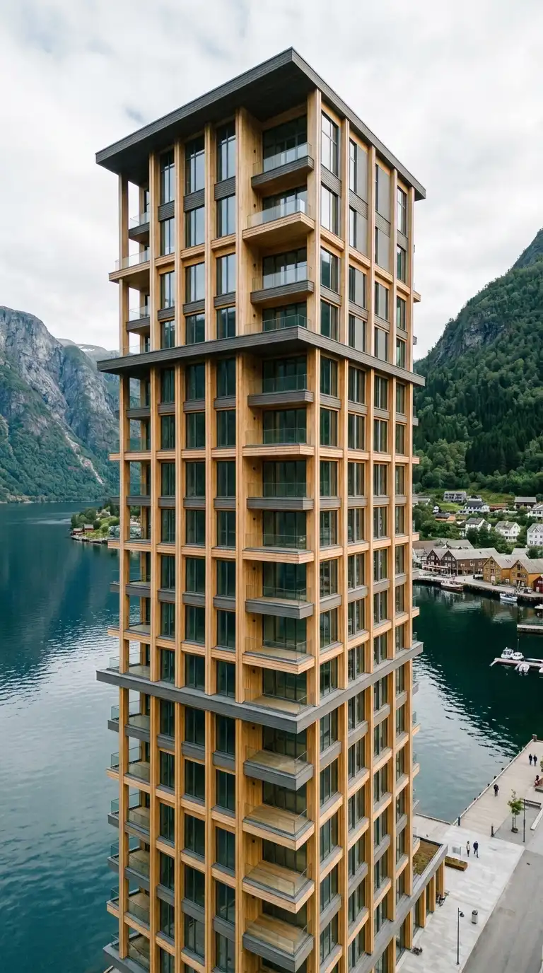 Mjøstårnet in Norway (2019), at 85 metres, is the defining example. The structure is visible: timber columns, beams, and CLT floor slabs. The aesthetic is warm, precise, and natural. The emotional effect is sustainable, innovative, and surprisingly warm for a tall building.