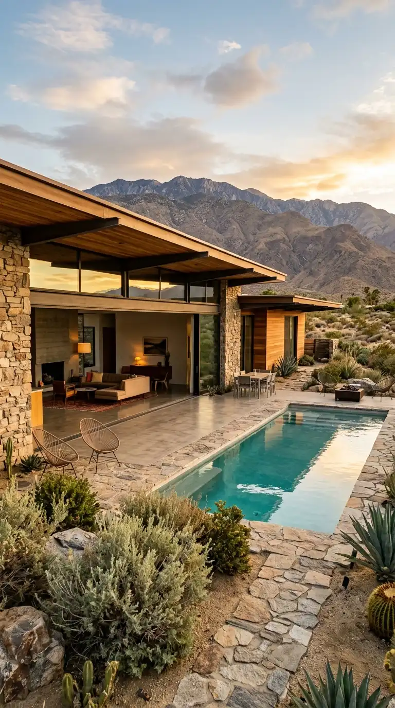 Desert Modernism, developed by architects like Richard Neutra and John Lautner in mid-century California and Arizona, responds to the harsh desert climate. The house has deep overhangs, large glass walls, and natural stone. The plan is open. The pool is integral.