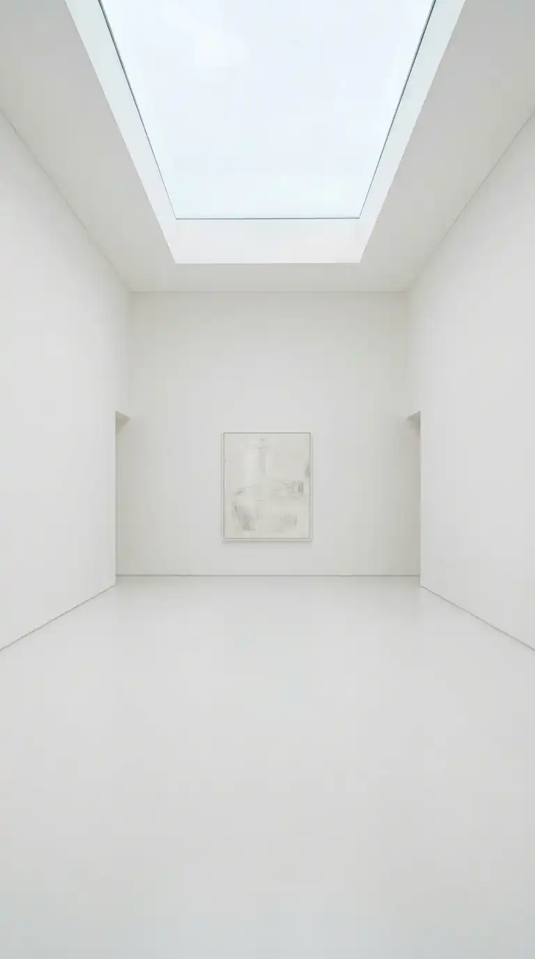 The white box gallery is the modern interior for displaying art. The space is a simple white cube or rectangle. The ceiling is high. The light is even and diffuse, often from skylights. There are no distractions — no colour, no ornament, no visible structure.