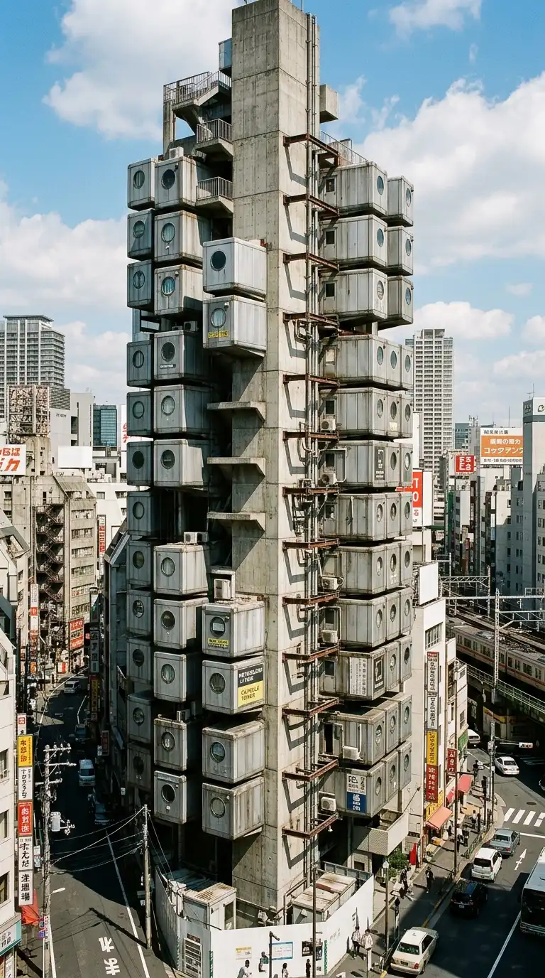 Kisho Kurokawa’s Nakagin Capsule Tower in Tokyo (1972) is the defining example. The concrete core supports 140 small capsules, each a self-contained living unit. The emotional effect is futuristic, adaptable, and technologically optimistic.
