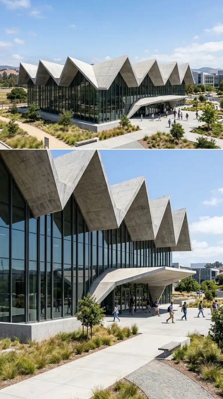 The roof is often the primary folded surface, spanning large spaces without internal columns. The emotional effect is faceted, structural, and origami-like.