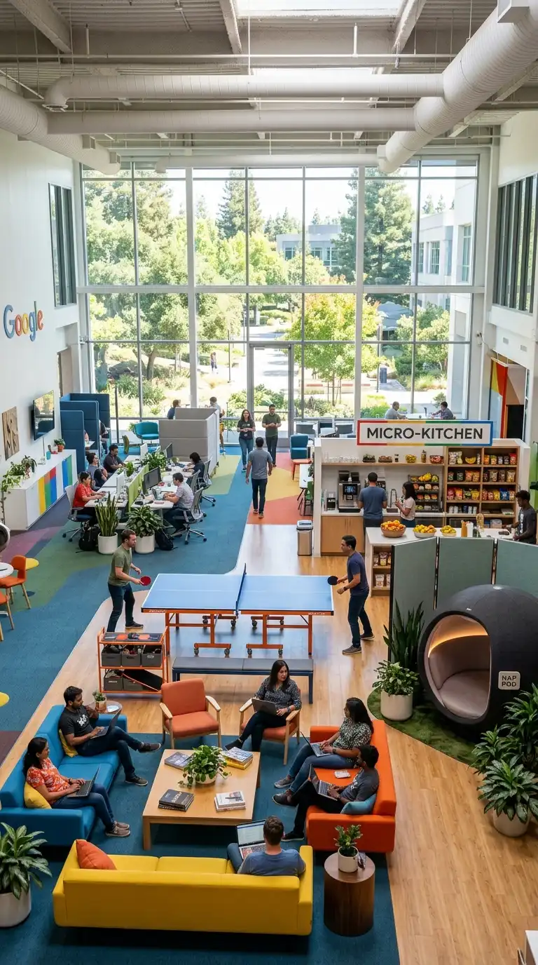 The Googleplex office — named after Google’s headquarters — represents the modern tech office aesthetic. The building is open, flexible, and amenity-rich. Workstations are open plan. There are lounges, kitchens, game rooms, and nap pods. The design encourages collaboration and creativity.