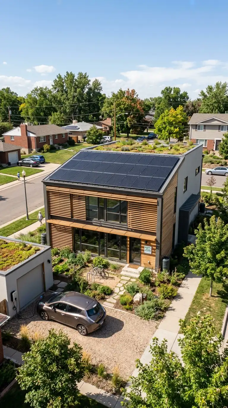 The zero net energy house produces as much energy as it consumes over a year. The design integrates solar panels, high-performance insulation, triple-glazed windows, and energy-efficient systems. The form is compact and oriented for passive solar gain.