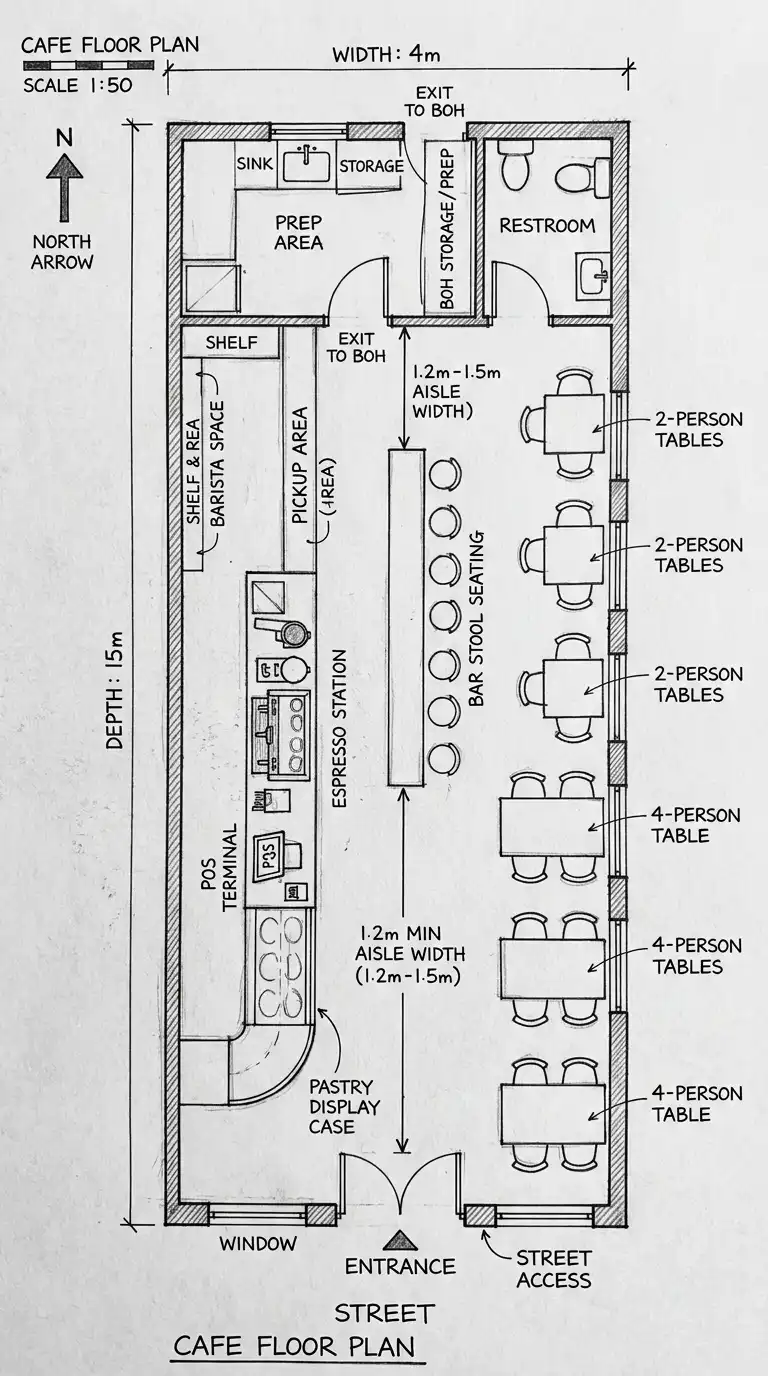 Linear CafeCounter along one wall, seating oppositeNarrow storefronts, high turnover4-8mMediumHigh