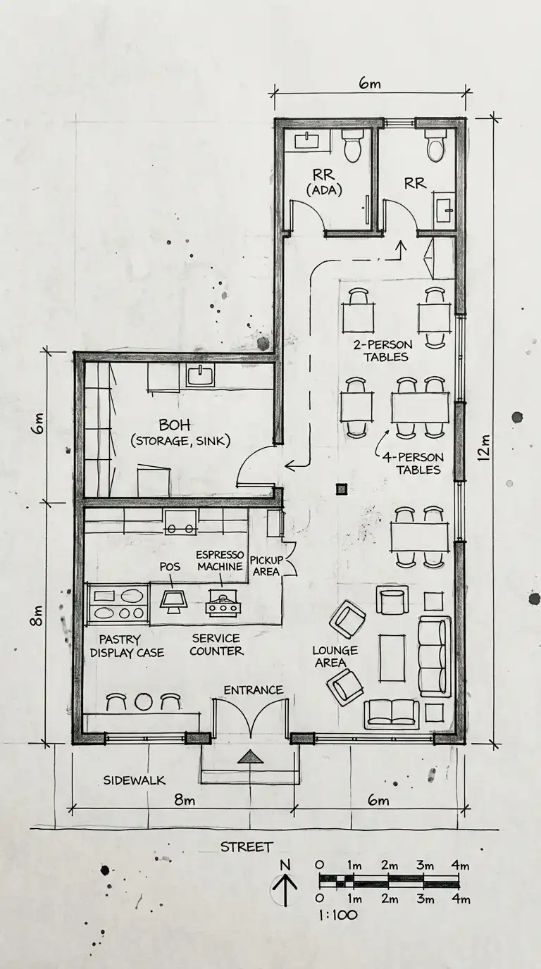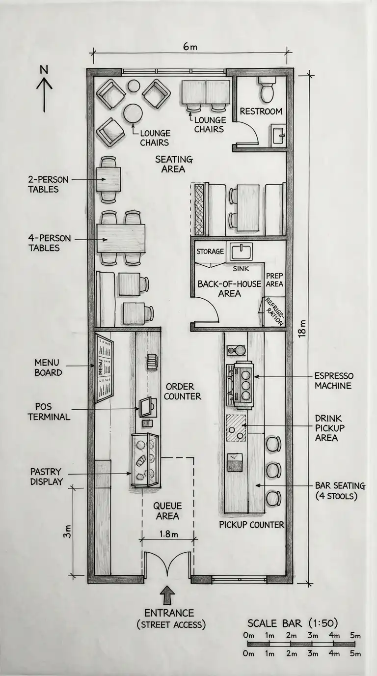 A cafe floor plan is not a restaurant floor plan. Unlike a restaurant, where the focus is on seated dining with table service, a cafe focuses on quick service, counter ordering, and a mix of seating types (tables, lounge chairs, bar seating). The challenge is balancing the service zone (counter, espresso machine, pastry display, POS) with the customer zone (seating, circulation, waiting area). The best cafe plans make the customer feel welcome but move them efficiently from order to pickup to seating.