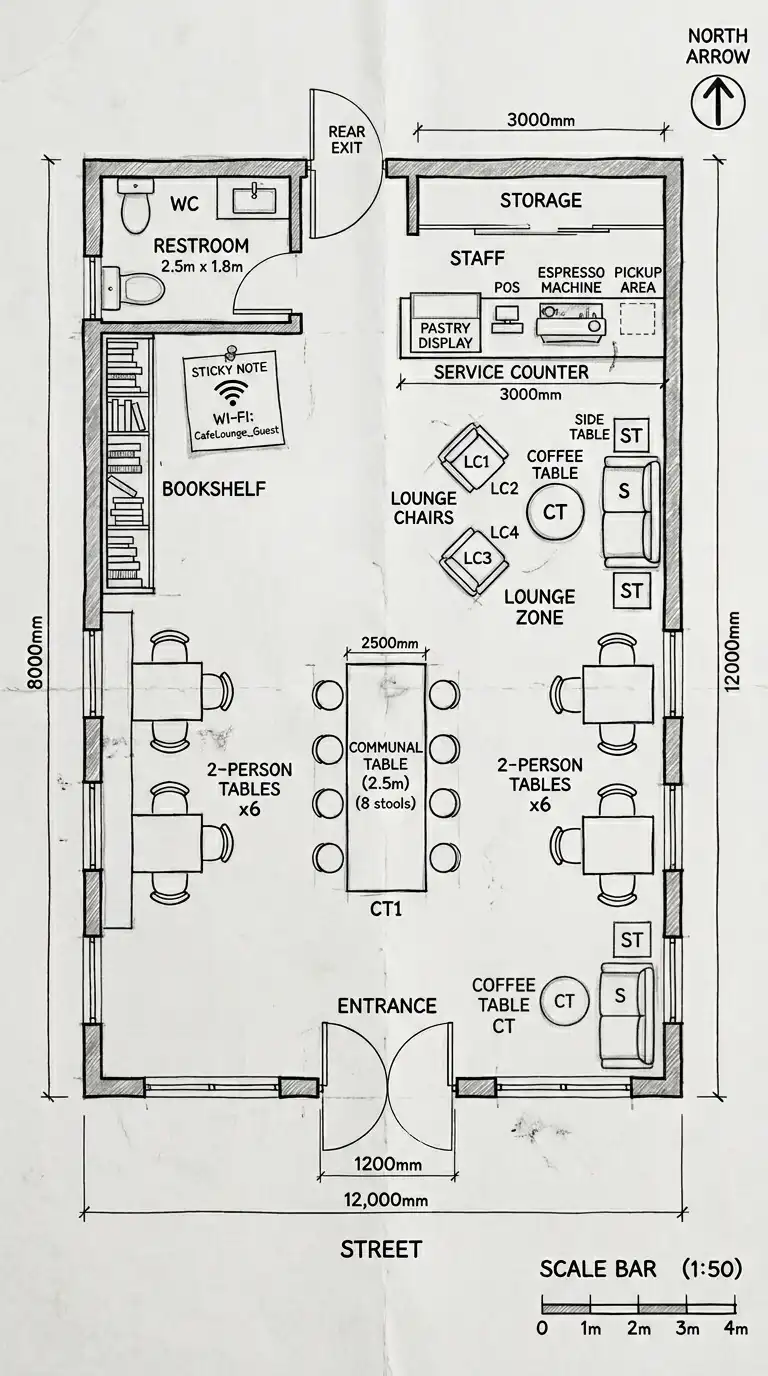 A cafe where seating is the priority, not speed. The service counter is small (2-3m long), with a limited menu (coffee, pastries, light food). Seating is generous: lounge chairs, sofas, communal tables, and standard tables. The atmosphere is relaxed (customers stay for hours, working or chatting). The counter is often at the back or in a corner, not dominating the space. This plan is for neighborhood cafes, bookshop cafes, or any space where customers linger.