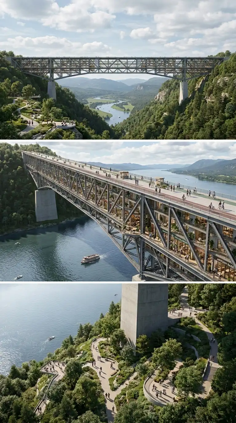 What if a building is also a bridge? This concept spans a river, valley, or road, with occupied space integrated into the structure. The bridge carries people and services, not just traffic.