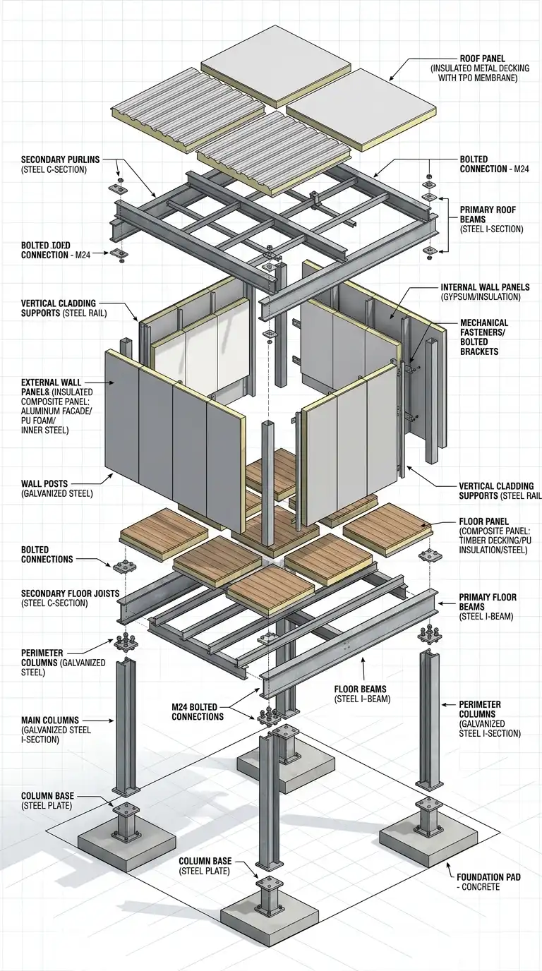 What if a building could be taken apart and moved? This concept designs for disassembly. Connections are bolted, not welded. Materials are chosen for their recyclability. The building is a kit of parts, not a monolithic object.
