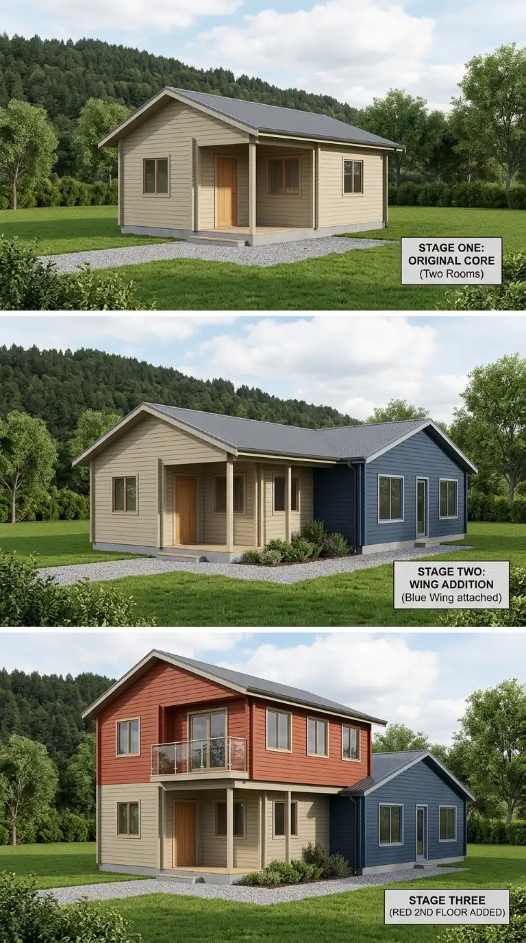 What if a building could grow? This concept designs for expansion over time. The building starts small — a core, a few rooms — with structural and mechanical capacity to add floors, wings, or modules as needed.
