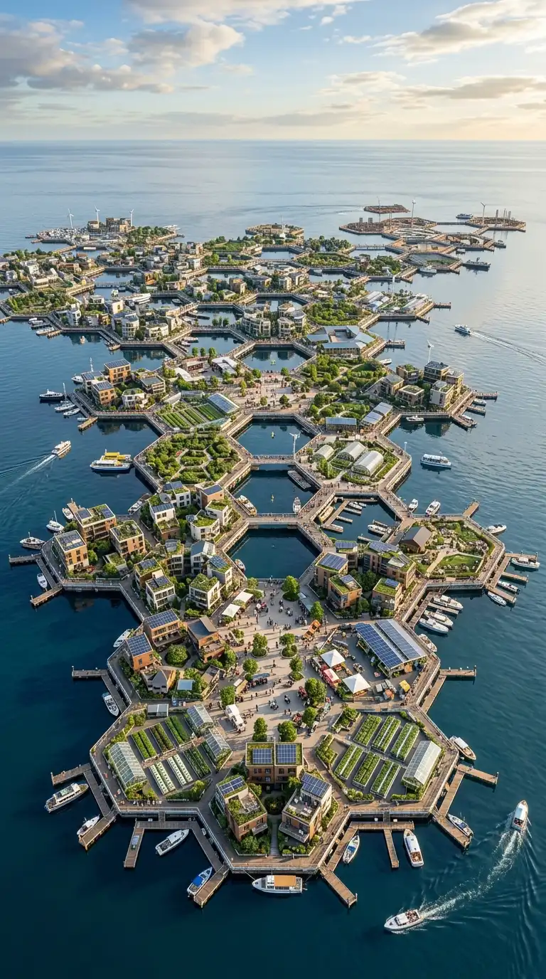 What if a city could float? This concept builds on water, not land. Platforms support buildings, streets, and parks. The city rises and falls with tides and storms. It can be towed to new locations or expanded indefinitely.