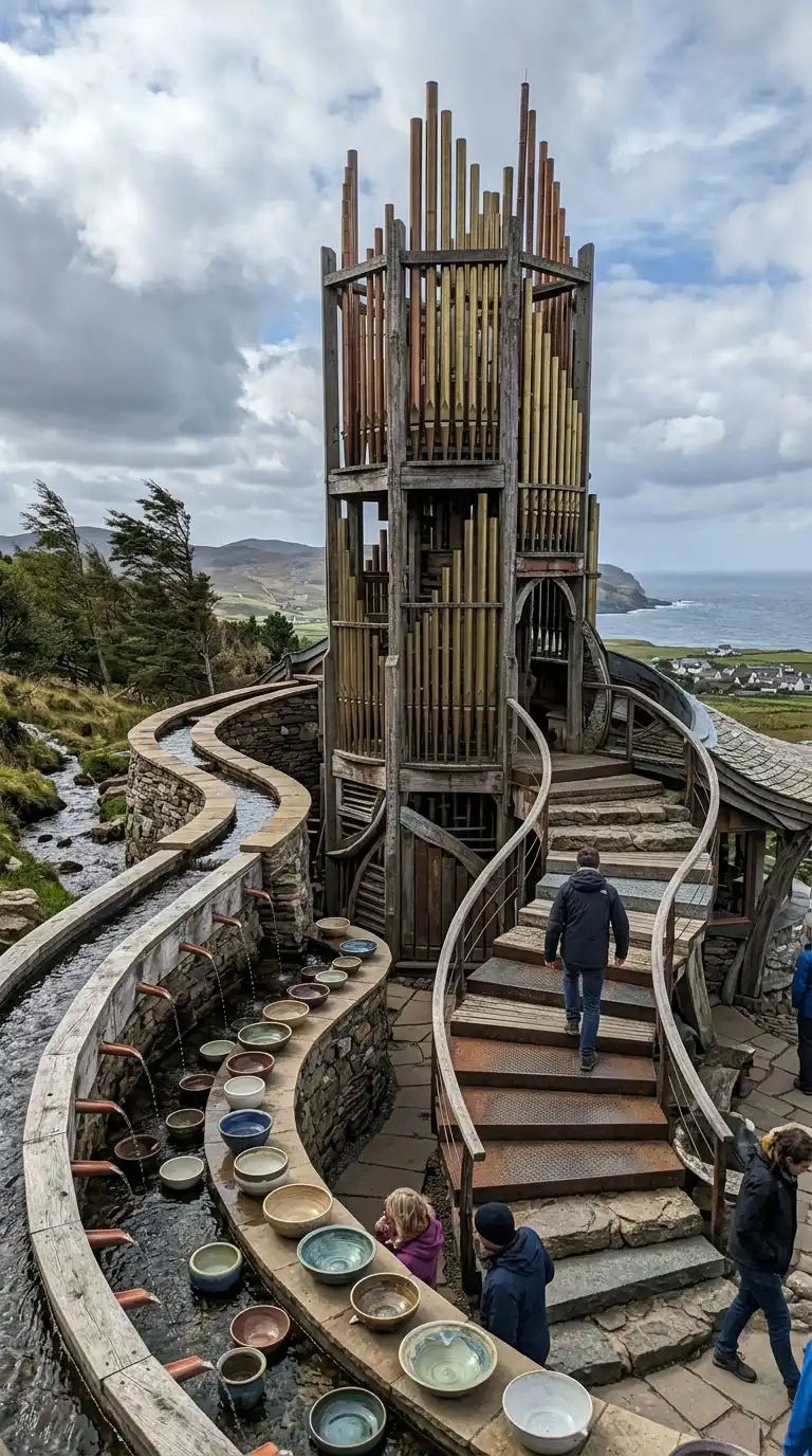 The building hums in the wind. Water drips through tuned pipes. Footsteps on different materials create a score. The emotional effect is musical, surprising, and experiential.