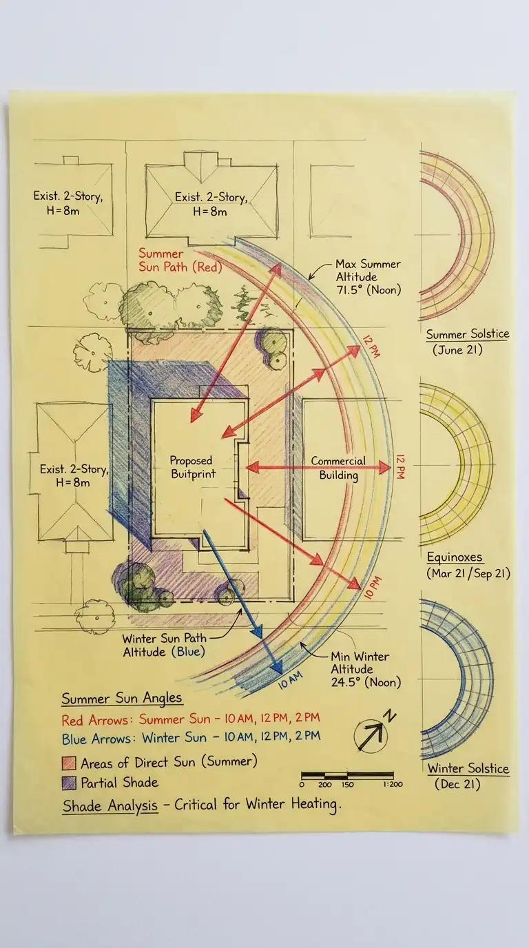To complete a sun path analysis, overlay a sun path diagram (specific to your site’s latitude) onto your site plan. For each significant facade and outdoor space, note the sun angles at key times: 9am, 12pm, and 3pm on the summer solstice (June 21), the equinoxes (March 20 and September 22), and the winter solstice (December 21). Shade the areas that receive direct sun. Identify areas in permanent shade from neighbouring buildings or trees. Use colour coding: red for high solar gain, blue for permanent shade, yellow for partial sun.