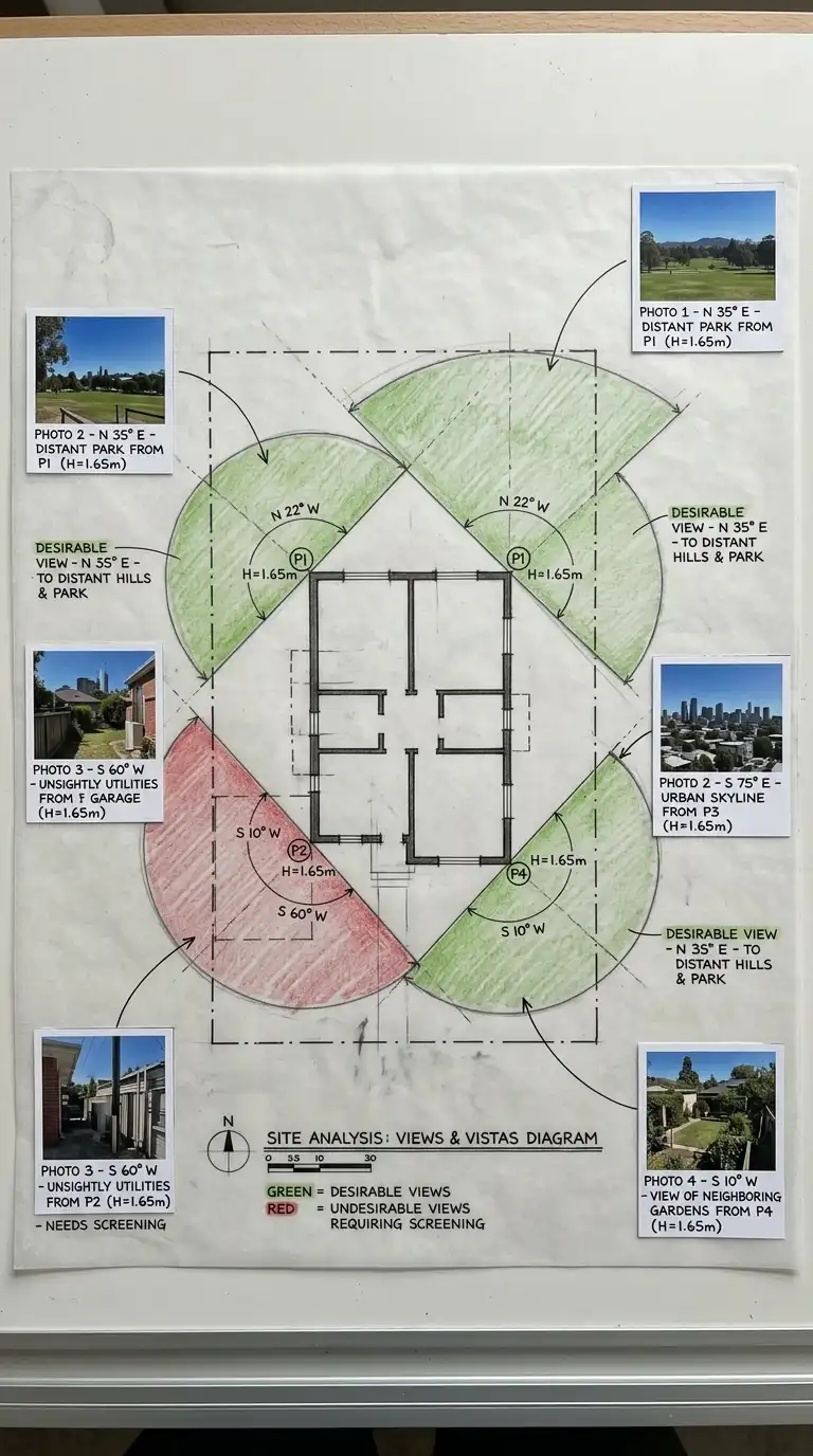 From every significant point on the site — future building corners, outdoor seating areas, entrance paths — record the view in each direction. Use a compass to note orientation. Photograph the view from each point at eye level. Draw view cones on your site plan showing which directions capture valuable views and which directions require screening. Mark the location of any unsightly elements that must be blocked. Note the height of the viewer: a seated person sees differently than a standing person.