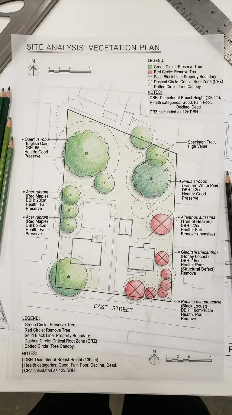 Conduct a tree survey identifying every tree over 15cm trunk diameter. Record species, trunk diameter, canopy spread, height, health (excellent, fair, poor, dead), and root zone extent. Mark trees for preservation (healthy, significant species, good location), removal (dead, diseased, or invasive species), or relocation (healthy but poorly placed). Identify other vegetation communities: meadows, wetlands, hedgerows, specimen shrubs. Note any protected species or habitats requiring permits. Draw a vegetation overlay showing all significant plants and their protection zones.