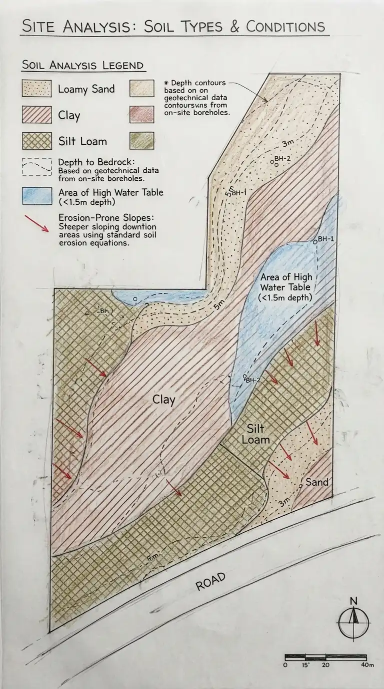 Soil determines foundation costs, drainage strategies, and landscape possibilities. A building on sand costs less to excavate but requires different foundations than a building on clay. Soil analysis prevents the expensive surprise of hitting rock where you expected dirt.