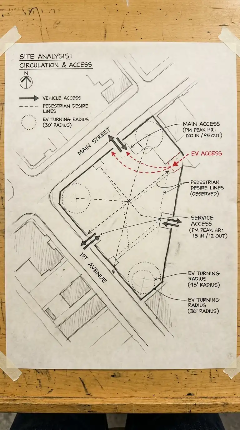 How do people, vehicles, and services reach the site? Circulation analysis maps every point of entry and every path across the site. It identifies conflicts between pedestrians and vehicles, opportunities for accessible routes, and the logical location for building entrances.
