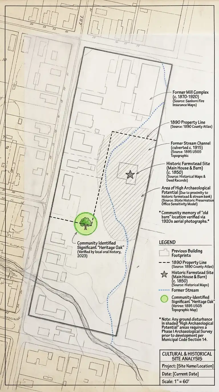 Research the site’s history through historical maps (Sanborn maps, plat maps, aerial photographs), property records, local historical societies, and oral histories. Identify any historic structures, archaeological potential, or culturally significant landscapes. Note the site’s original vegetation and land use before development. Record any community associations with the site — a beloved tree, a gathering place, a memory. Mark property boundaries and easements that have changed over time. Identify any requirements for historic preservation review or tribal consultation.