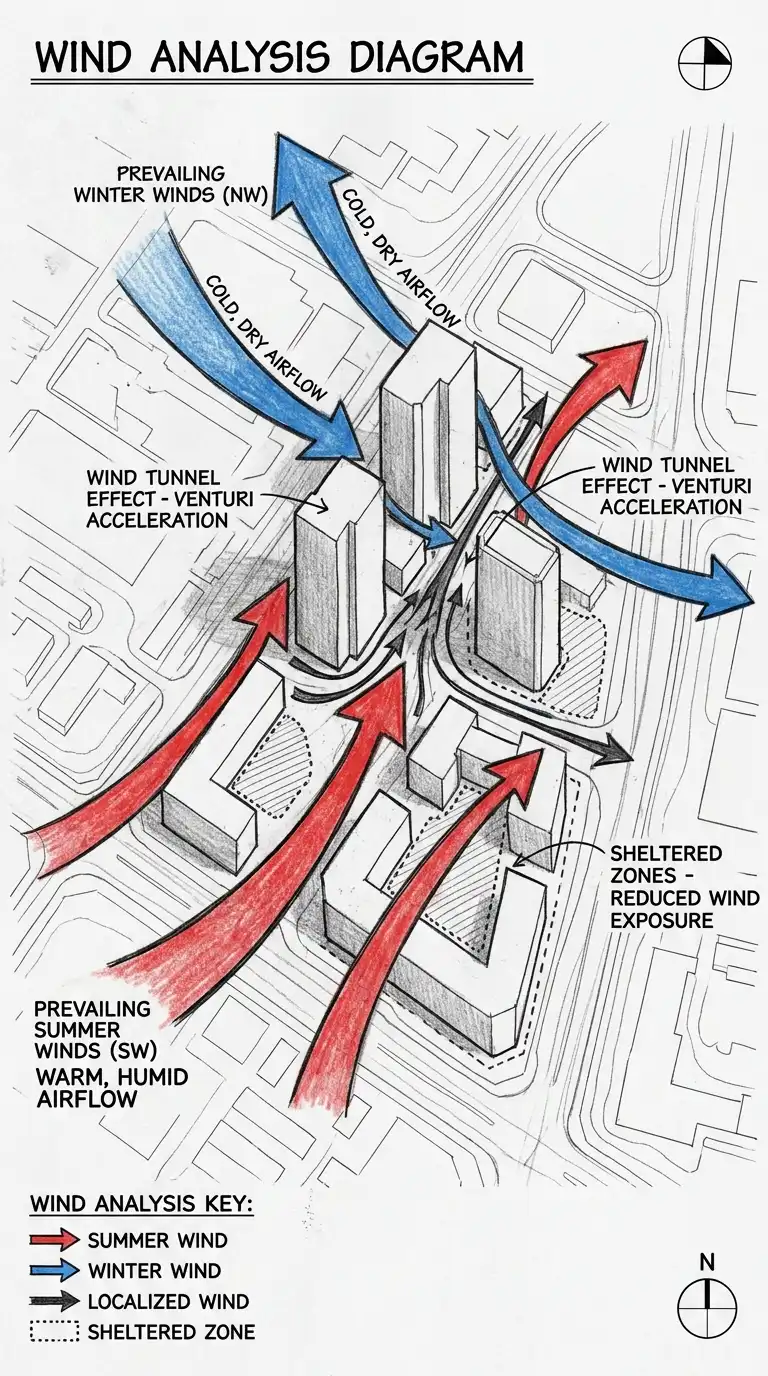 Collect local wind data from weather stations or climate databases showing average wind speeds and directions by season. On your site plan, draw arrows indicating prevailing summer winds (typically from the south or southwest in the northern hemisphere) and winter winds (typically from the north or northwest). Identify wind tunnels created by adjacent buildings and sheltered zones where air is still. Mark areas where wind speed exceeds comfortable levels for outdoor use (above 5 metres per second).