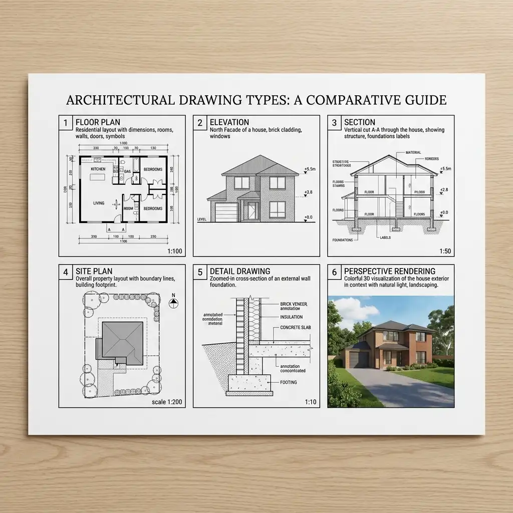 Professional architectural practice relies on a family of drawing types, each conveying specific spatial and technical information. Understanding each type is fundamental to reading and producing architectural documents.