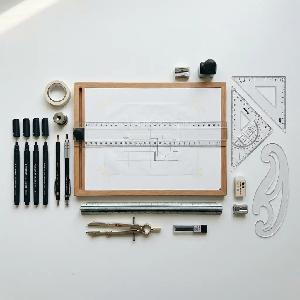 Technical pen set (0.13–0.8mm) — Rotring Rapidograph or Staedtler Mars are industry standards. Different nib sizes correspond to different line weights: 0.13mm for dimension lines, 0.35mm for visible edges, 0.5–0.7mm for cut lines.